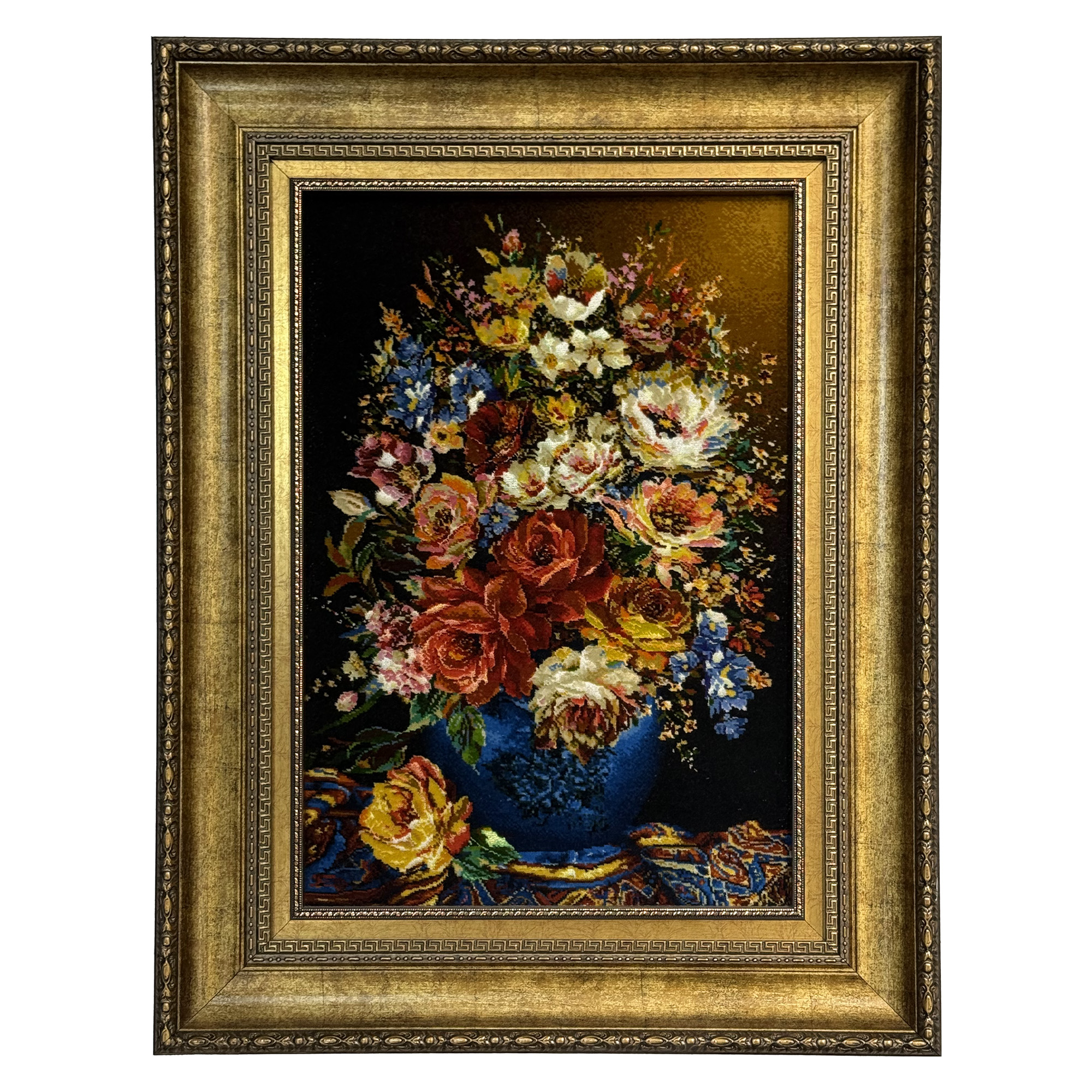 همان‌طور که در تصویر مشاهده می‌کنید، این تابلو فرش با طرحی چشم‌نواز از گل‌های رنگارنگ بافته شده است. دسته‌ای از گل‌های رز و شکوفه‌های متنوع درون یک گلدان آبی رنگ قرار گرفته‌اند و به زیبایی در مرکز قاب خودنمایی می‌کنند. ترکیب رنگ‌های سرخ، زرد، سفید و آبی در کنار پس‌زمینه‌ای تیره، جلوه‌ای بی‌نظیر و سه‌بعدی به اثر بخشیده است. این نوع طراحی، نه تنها حس طراوت و زندگی را منتقل می‌کند بلکه تداعی‌کننده باغی جاودانه در دل تار و پود فرش است.