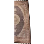 در حاشیه، رنگ افسری (نوعی آبی سلطنتی)، جلوهای خاص به فرش بخشیده و دو سر گلیم آن، نشاندهندهی پایانبندی سنتی و اصیل قالی است. شکل کلی فرش مستطیل است اما با توجه به نسبت ابعاد، تناسبی نزدیک به مربع دارد که آن را برای اتاقنشیمنها و فضاهای رسمی بسیار مناسب میکند.
