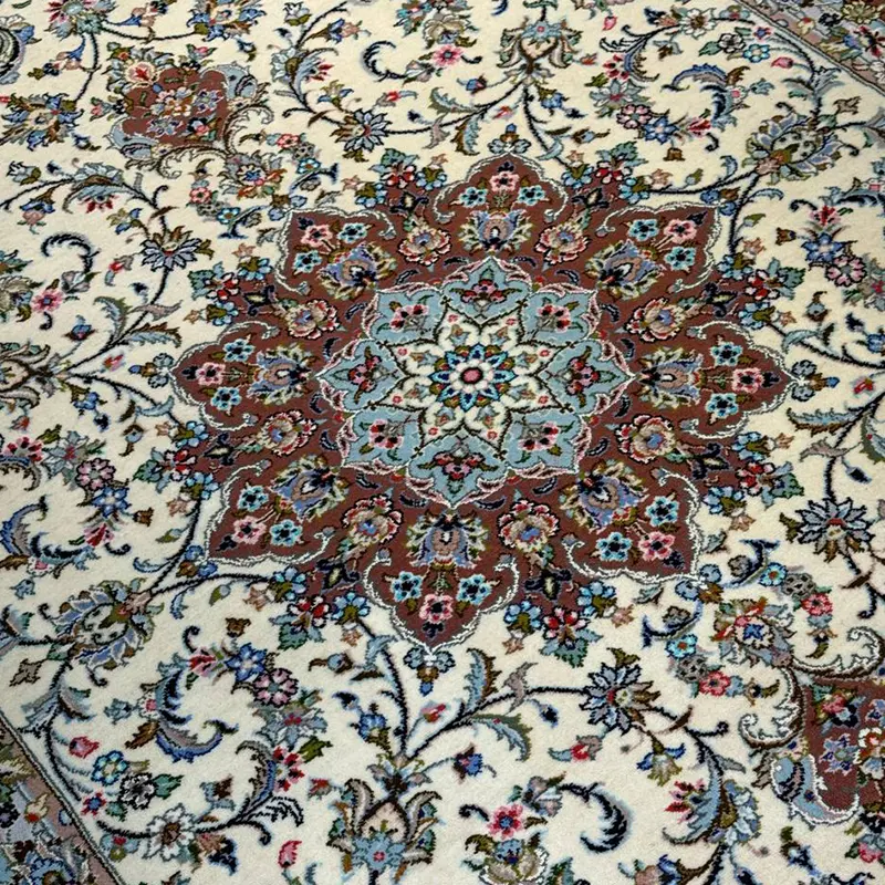 زیبایی و اصالت: طرح گل ابریشم و رنگ خاکی حاشیه، جلوهای باشکوه و در عین حال آرامبخش ایجاد میکند.