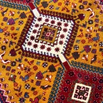 طرح کلی: لچک ترنج با سه ترنج منظم و نمادهای هندسی، روی زمینهی زرد طلایی با لچکهای سرمهای. طراحی این فرش تلفیقی از المانهای اصیل و نمادهای سنتی قبیلههای فارس است.