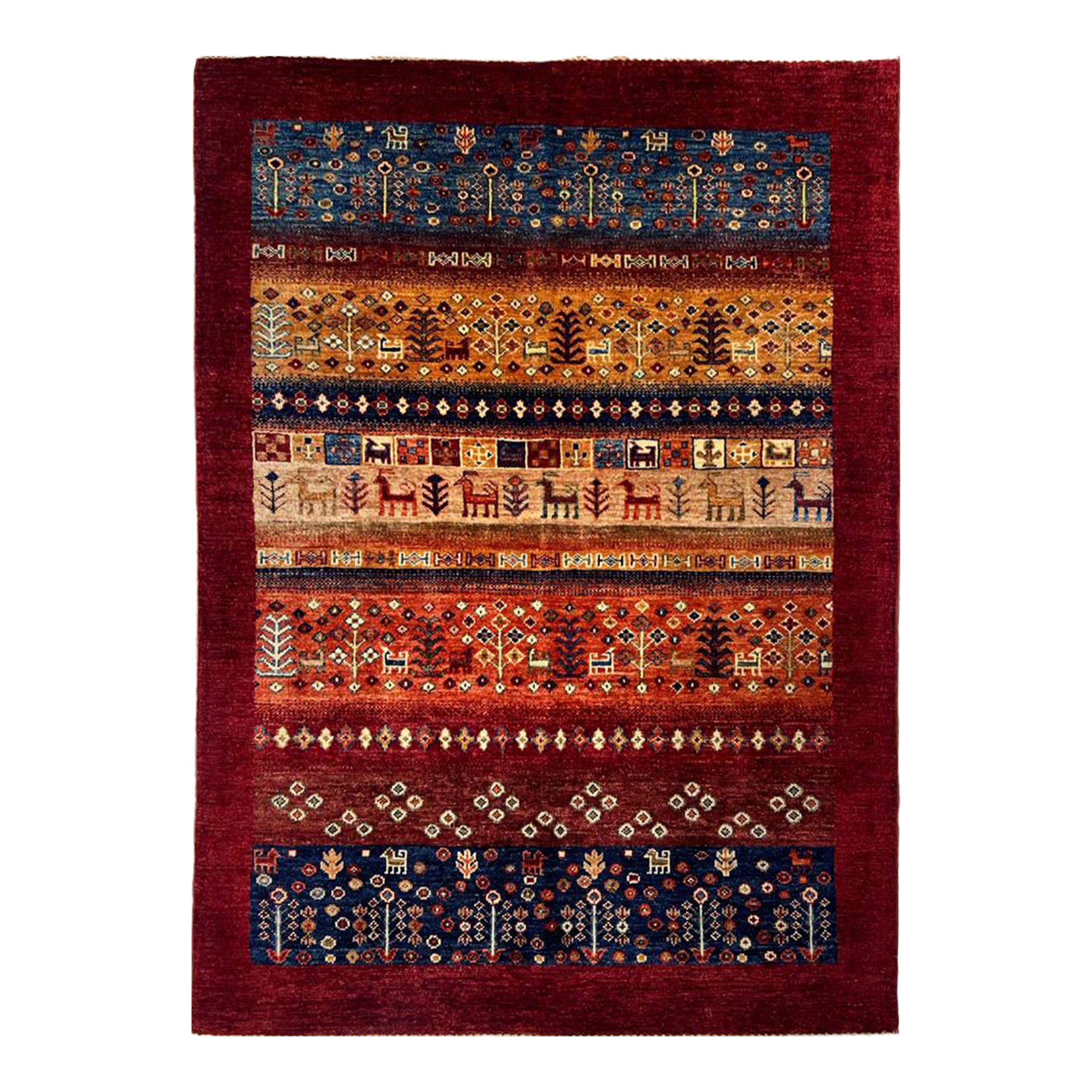 • طرح کلی: نقشه محرمات با ترکیب خطوط افقی رنگارنگ و نمادهای قشقایی