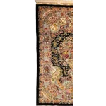 زمینهی مشکی قالیچه، مانند شبهای پرستارهی کویر قم، عمیق و مجلل است. بر این بستر تاریک، ترنج گلدانی یکطرفه و نقشهی کلاسیک لچک ترنج بهزیبایی نشستهاند. نقوشی که گویی از دل باغی خیالانگیز سر بر آوردهاند.