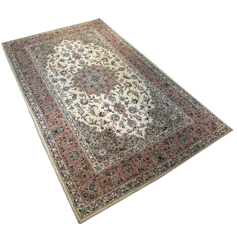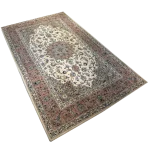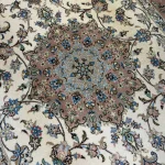 طرح این قالیچه، لچک و ترنج با زمینه کرم است؛ طرحی کلاسیک و بسیار محبوب در فرشهای اصیل ایرانی. ترنج میانی همچون خورشیدی درخشان در دل زمینهای لطیف از رنگ کرم جای گرفته و لچکهای چهارگوشه فرش، توازن و تقارن را به اوج رساندهاند. زمینه کرم، حس آرامش و فضا را منتقل میکند، درحالیکه حاشیه پیازیرنگ، با درخشش گرم خود، قاببندی هنرمندانهای به این اثر داده است.