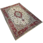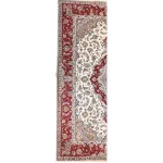 زمینه کرم رنگ این قالیچه، فضا را روشنتر و دلبازتر نشان میدهد. در طراحی کلی، از طرح لچک ترنج استفاده شده که یکی از اصیلترین و سنتیترین نقوش در فرش ایرانی است. این طرح با تکرار هندسی و هنرمندانه خود، چشم بیننده را به مرکز فرش هدایت میکند و حس توازن و تقارن را منتقل میسازد.