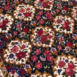 این فرش با ابعاد دقیق ۲۲۰ در ۳۲۰ سانتیمتر (۷.۴ متر مربع) بافته شده که در دسته قالیهای بزرگ و رسمی قرار میگیرد. وزن فرش حدود ۳۰ کیلوگرم است که نشاندهنده تراکم مناسب، ضخامت نخ، کیفیت پشم و رجبندی حرفهای آن است. تراکم بین ۳۵ تا ۴۰ رج در هر ۷ سانتیمتر، نهتنها انسجام ساختاری ایجاد کرده، بلکه امکان خلق جزئیات ظریف را هم فراهم کرده است. این ویژگیها باعث میشود که این فرش هم در برابر سایش مقاوم باشد، هم از نظر بصری دقیق و ظریف بهنظر برسد.